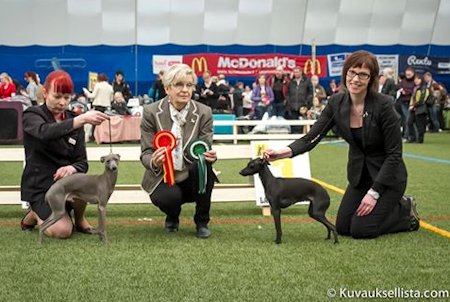 At the Oulu INT Italian Greyhounds were judged by Mrs Inga Siil from Estonia. Urho, Northgate's Midnight Fantasy, was BOB with cacib. At the Pharaoh Hound ring (judge Mrs Birgitta Svarstad) Skumpan (Northgate's Dom Perignon) was BOB, Diva (Northgate's Queen Supreme) was BOS with CC and Saga (Northgate's Poetry In Motion) BB-2 with cacib. At the group finals Mrs Birgitta Svarstad placed Urho as BIG-2!!